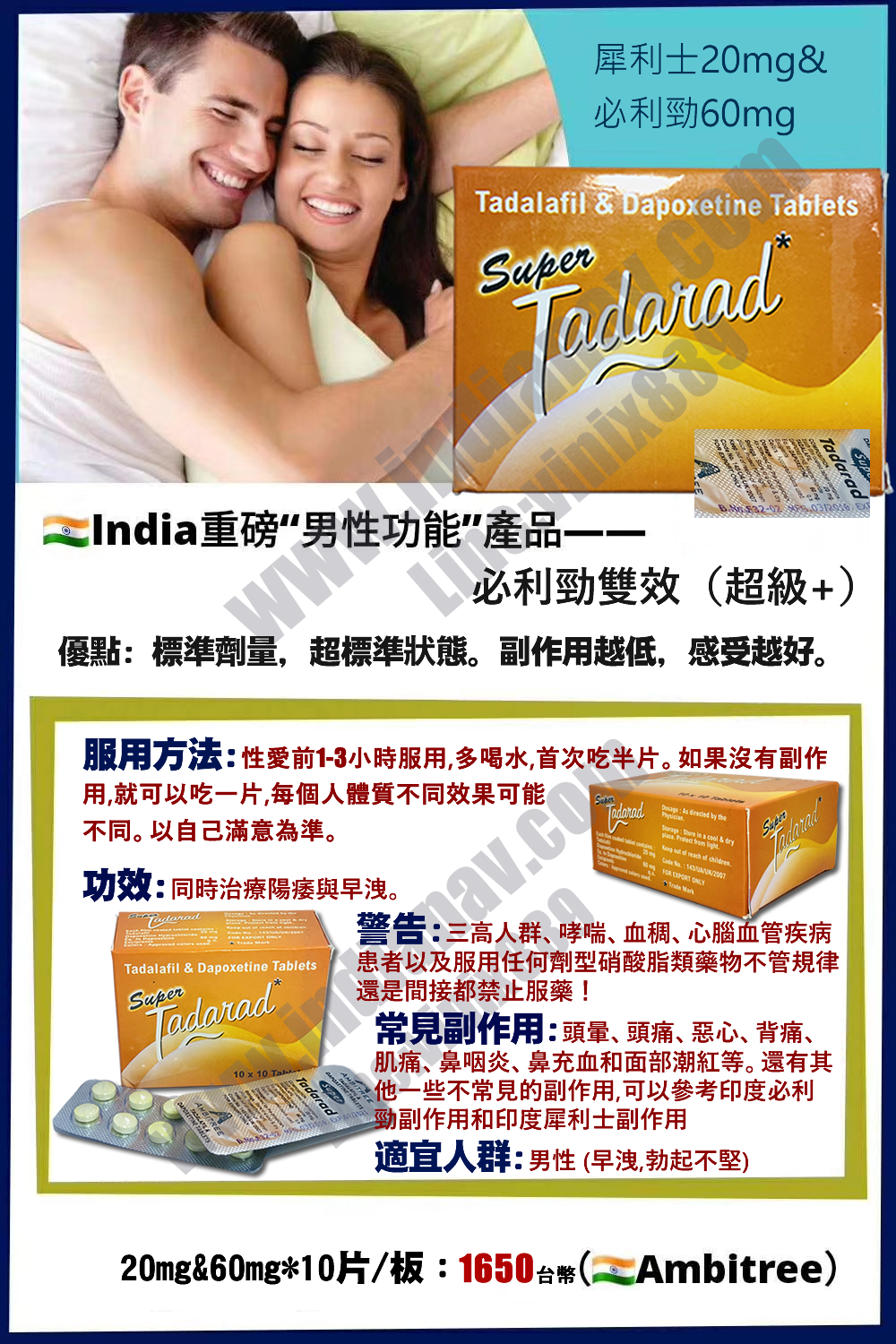 超級必力勁是一種有效的藥物,可以幫助男性應對陽痿和早泄。必利勁是目前唯一針對早泄(PE)研發的有效成份,也是唯一獲得國家食品監督管理局(CFDA)批准的早泄適應症的治療藥物。印度超級必利勁雙效片每顆含有他達那非(助勃成份),能有效改善早泄的所有指標,包括增強射精控制能力,延長陰道內射精潛伏時間,並且具有良好的耐受性。首次服用該藥物,即可起效。在性生活開始前2-3小時服用即可,能夠在體內迅速吸收併發作用。而且,超級必利勁雙效片還含有20mg他達那非,有效解決必利勁無法助勃的問題,讓患者能達到更好勃起硬度,消除緊張情緒,從容應對性活動,從而達到了1+1》2的效果。